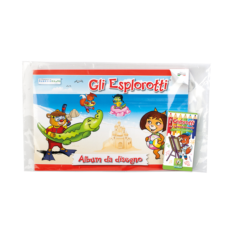 Il Kit è composto da un album da disegno a scelta da 8 o 16 fogli bianchi traforati e una scatolina di 6 pastelli corti da inserire in una busta in polipropilene fornita con adesivo removibile. Gli album sono forniti in 4 varianti di copertina.