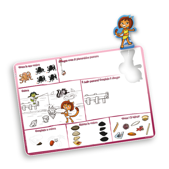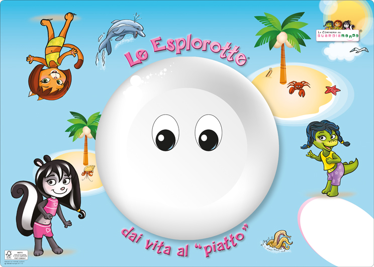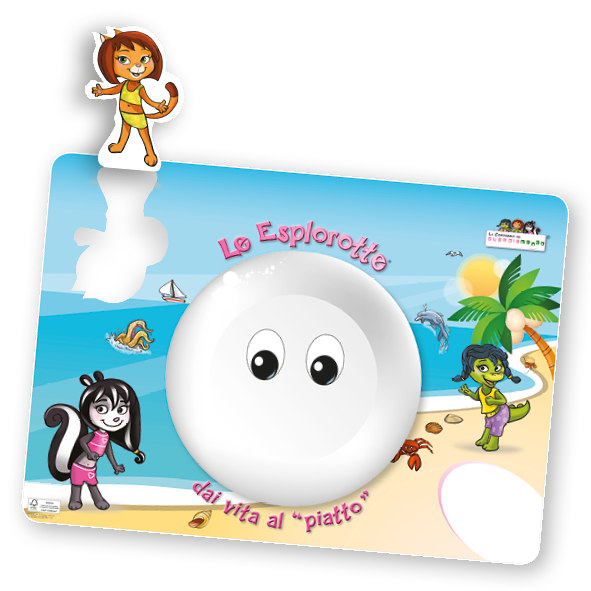 Tovagliette colazione, dimensioni 42×30 cm stampate a colori su ambo i lati. Tutti i modelli sul fronte offrono la possibilità al bambino di personalizzare il piatto disegnandovi una caricatura e sul retro riportano diverse attività di gioco e spazi da colorare, per intrattenere a tavola i bambini in maniera creativa.